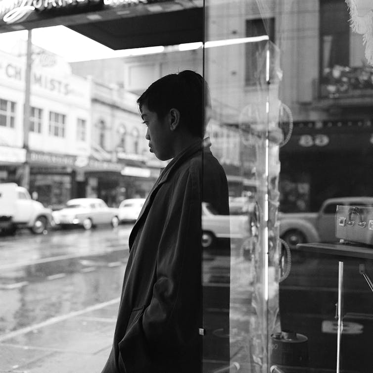 Bleak shop facades line this commercial canyon, offering the subject no joy or optimism – just an awning to shelter from the drizzle. Above all, though, the viewer is drawn to the solemn stillness of the subject’s face, which conveys a sense of overpowering loneliness and mournful gloom.