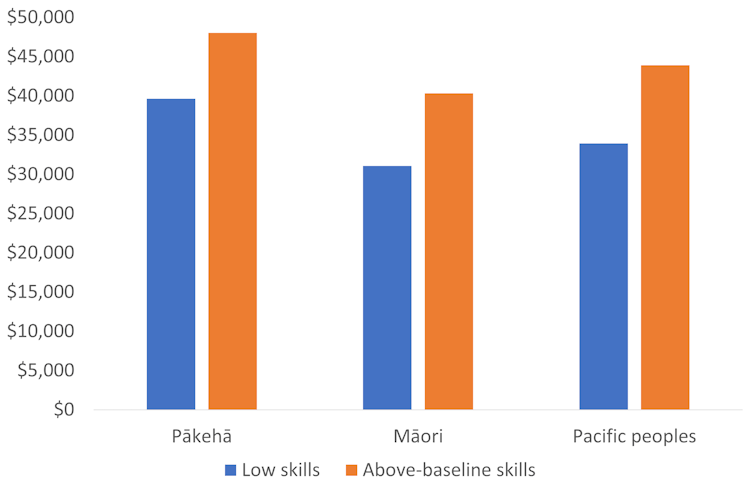 Ethnicity also plays a powerful role. For example, we found that at age 25, Māori with above-baseline literacy and numeracy skills have about the same average earnings as Pākehā with low skill levels.
