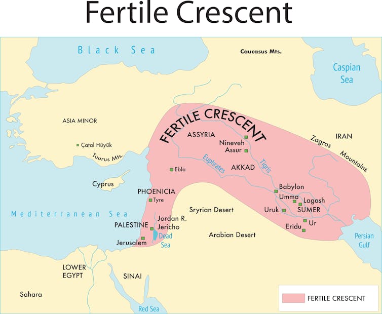 The development of agricultural knowledge some 12,000 years ago gave rise to permanent settlements. The earliest were in the Levant region (across modern-day Iraq, southwestern Iran and eastern Turkey), in an area called the “Fertile Crescent”.
